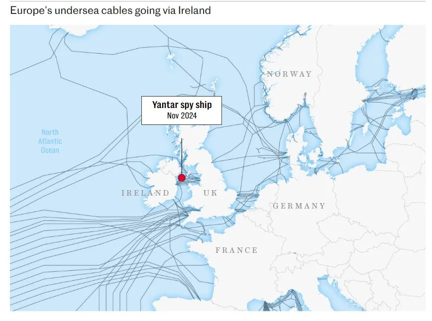 - У листопаді 2024 року там помітили російський корабель "Янтар". Він цікавився кабелями Microsoft і Google (ці компанії мають штаб-квартири в Ірландії) і залишив у воді датчики для відстеження підводних човнів Королівського флоту. Також "Янтар" здатен розрізати кабелі.