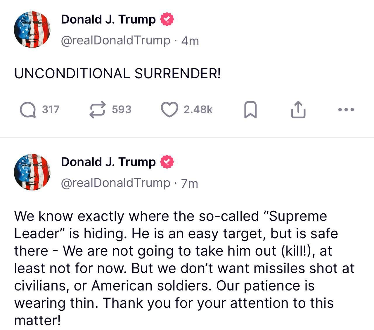 Цікаво, що у наступному пості глава Білого дому написав, що Іран має "безумовно капітулювати".