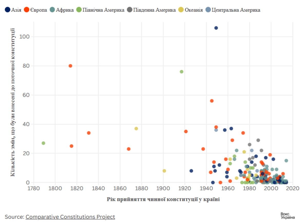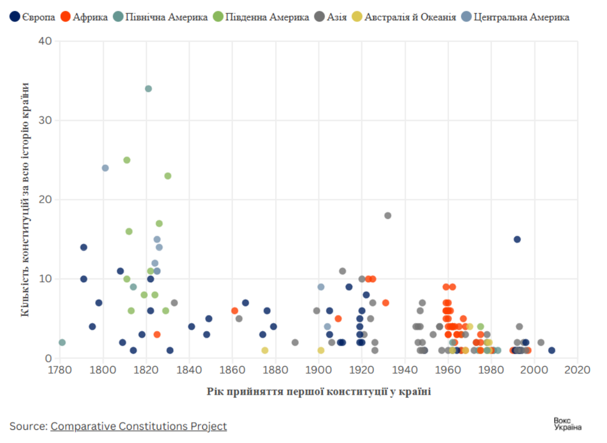 Кількість конституцій та рік ухвалення першої у різних країнах / Вокс Україна