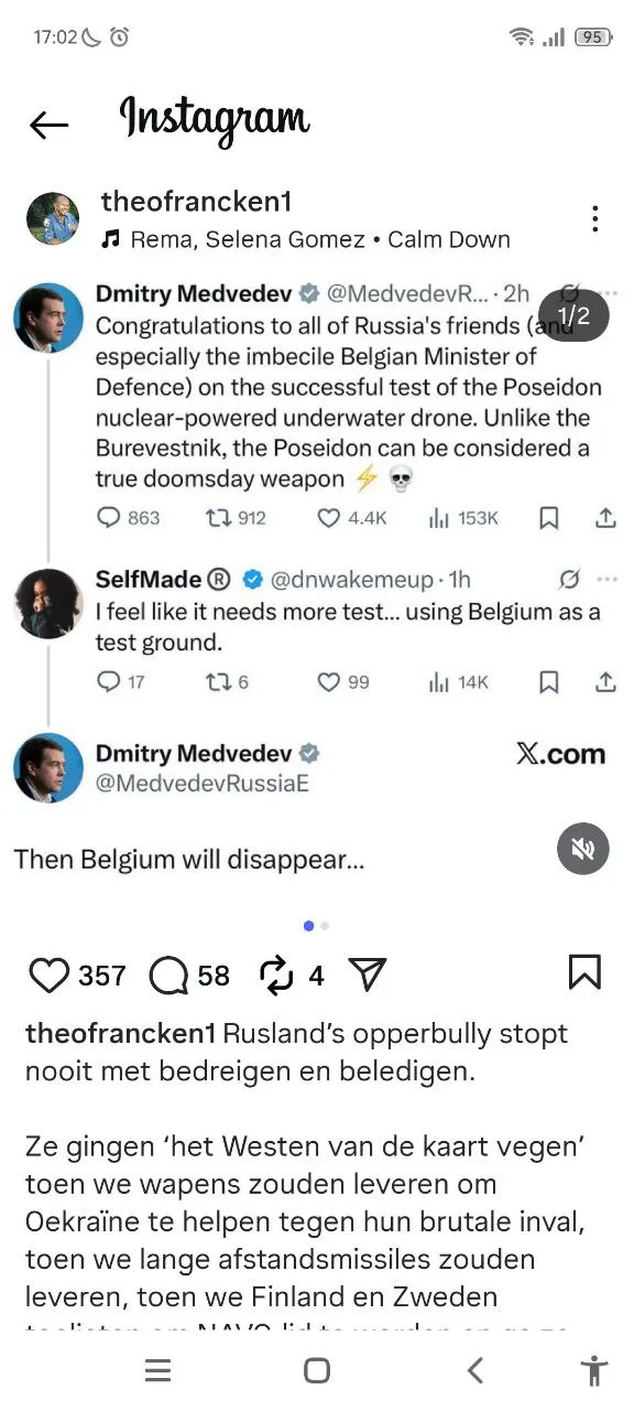 Politico звернули увагу, що цей допис Тео Франкена опубліковано з піснею американської попспівачки Селени Гомес Calm Down. У такий спосіб бельгійський міністр ніби закликав Медведєва заспокоїтися.