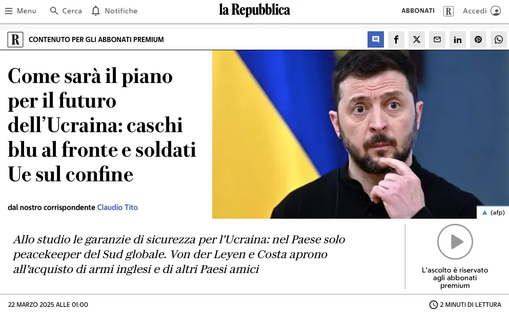 22 березня 2025 року журналісти видання La Repubblica у матеріалі під назвою "Як виглядатиме план майбутнього миру в Україні: блакитні шоломи на фронті та солдати ЄС на кордоні" розповіли про новий мирний план, який передбачає появу військ союзників України на територіях, які вона контролює. А також введення миротворчої місії під егідою в ООН, яка б мала розділити Сили оборони та російських окупантів.