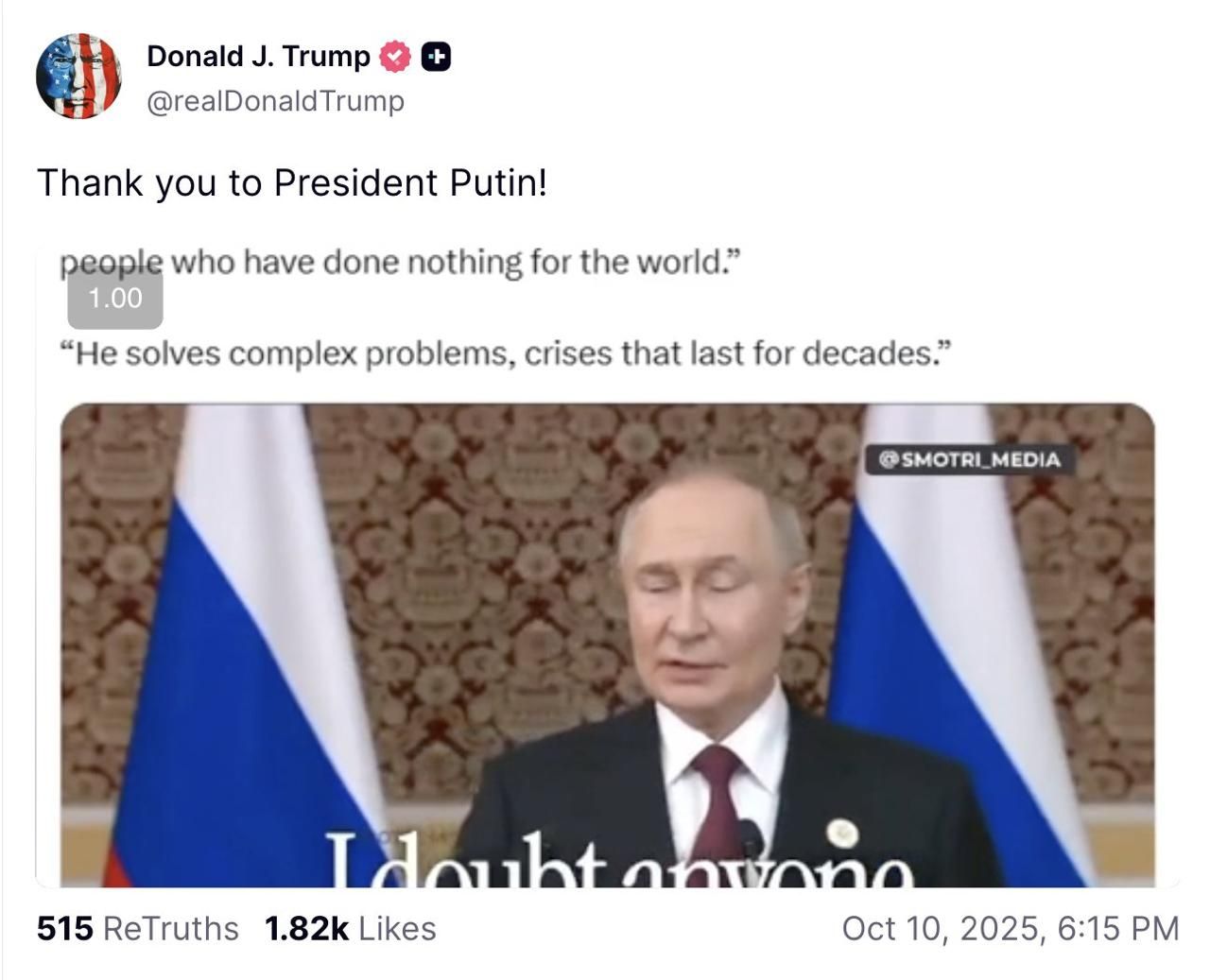 У п'ятницю, 10 жовтня, президент США Дональд Трамп висловив подяку президенту Росії Володимиру Путіну після того, як Нобелівський комітет не присудив йому премію миру.
