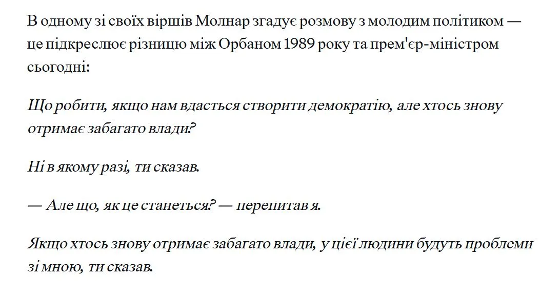 Інший співрозмовник медіа, який добре знає Орбана, – Петер Молнар. Вони були однокурсниками в будапештському Університеті Етвеша Лоранда. Молнар також вийшов із "Фідес" в 1994-му, коли партія змінилася.