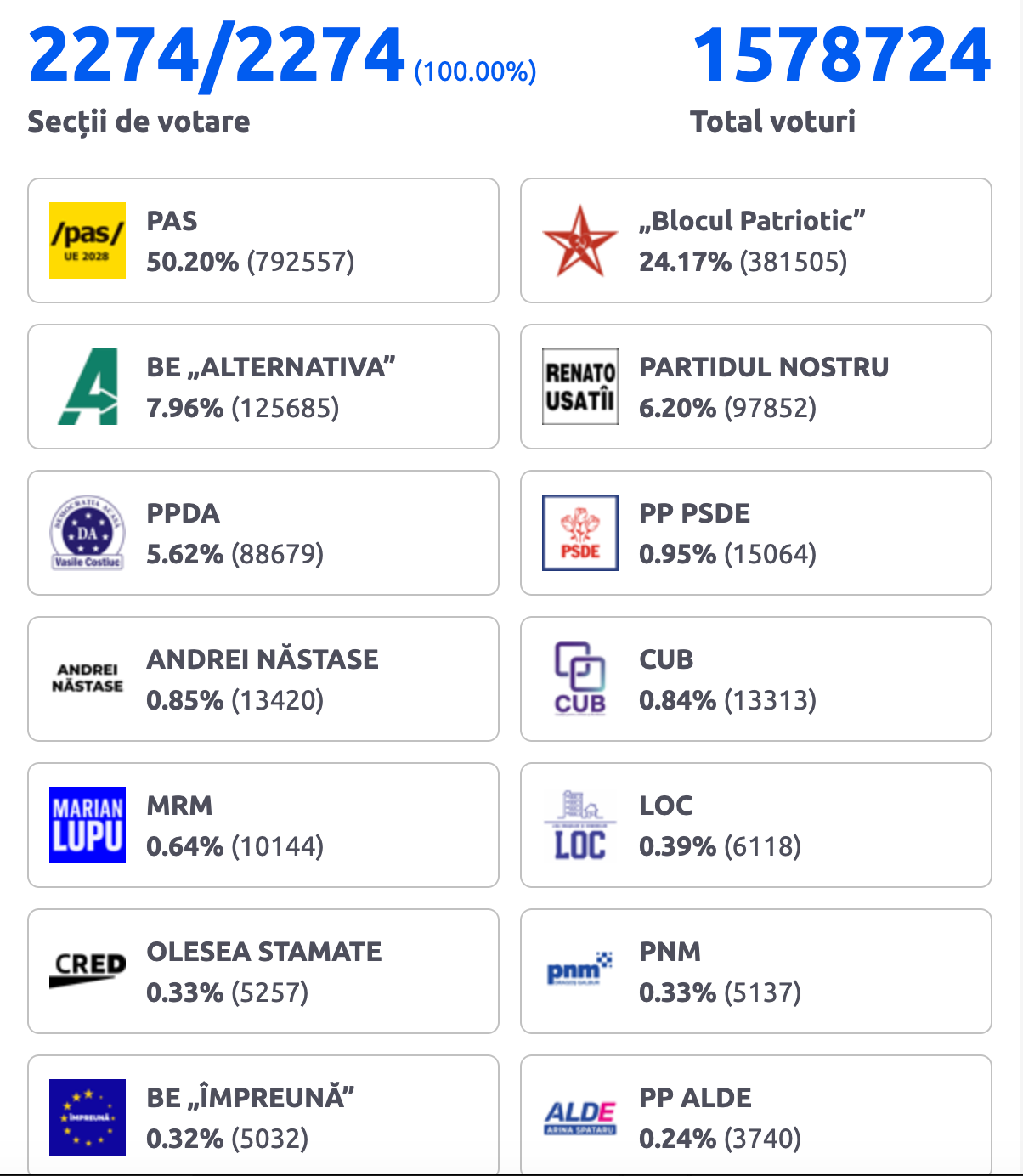 Згідно з даними Центральної виборчої комісії, лідерську позицію займає партія Маї Санду "Дія і справедливість". Пропрезидентська політична сила здобуває 50,20% голосів виборців.