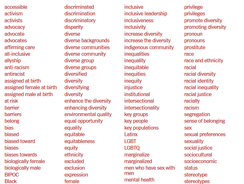 Серед переліку опинилися такі слова, як: активісти, антирасизм, приналежність, грудне вигодовування, кліматична криза, різноманітність суспільства, інвалідність, дискримінація, рівність, фемінізм, гендер, іммігранти, ЛГБТ, психічне здоров’я, меншини, пригноблення, орієнтація, вагітні, расова справедливість, расизм, секс, трансгендер, жертви.