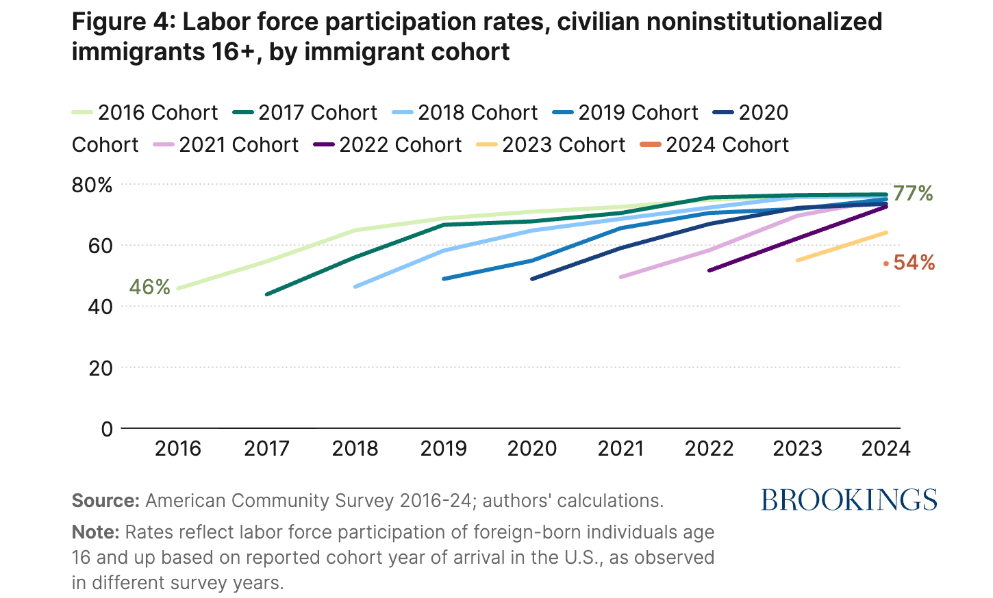Близько 77% всіх мігрантів старше 16 років мають роботу або перебувають в процесі пошуку / Джерело Brooking Institution
