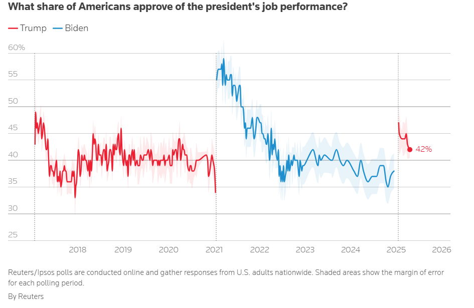 При цьому західне інформагентство звертає увагу, що рейтинг схвалення Трампа залишається вищим, ніж рейтинги, які спостерігалися протягом більшої частини президентства його попередника-демократа (Джо Байдена) за даними опитування Reuters/Ipsos.
