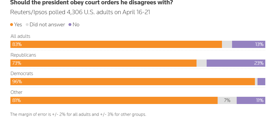 Згідно з опитуванням, більшість американців (83%) переконані, що президент має дотримуватись рішень федеральних судів, незалежно від особистого ставлення.