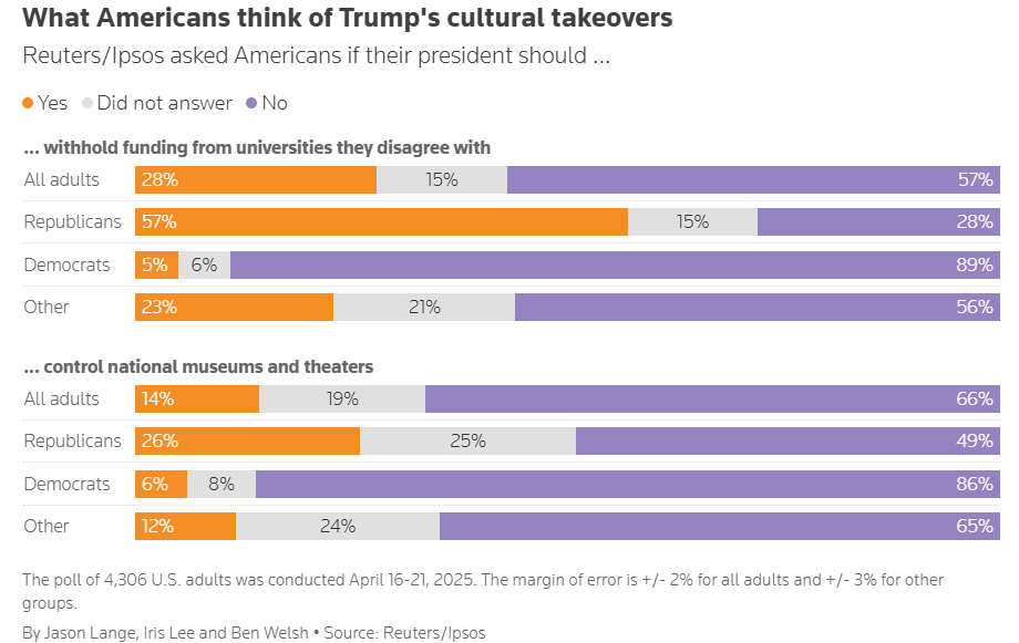 Окрему увагу привернула спроба адміністрації Трампа впливати на культурні й освітні інституції. Зокрема, 66% опитаних вважають, що президент не має права втручатися в управління національними музеями чи театрами.