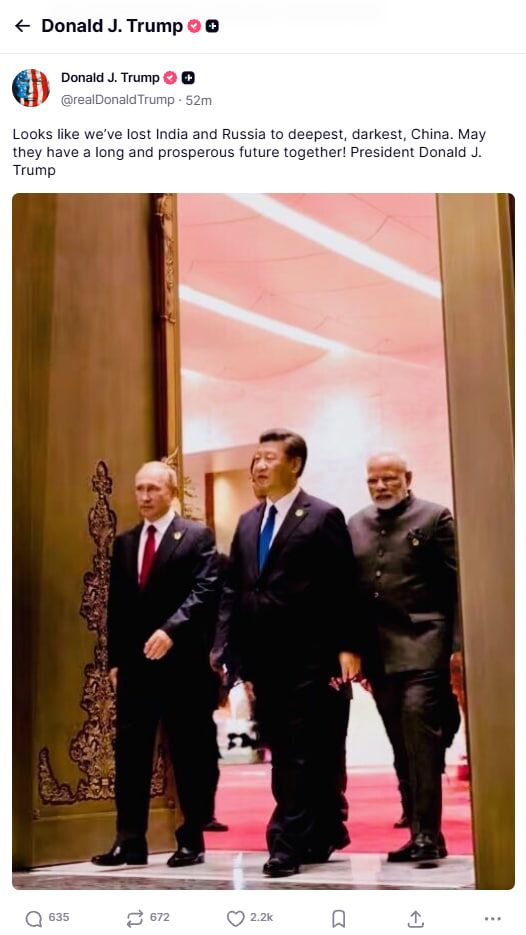 - Дональд Трамп заявив, що Росія та Індія стали союзниками Китаю, опублікувавши фото лідерів трьох країн з форуму Шанхайської організації співробітництва.