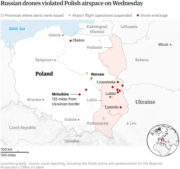 Карта фиксации и падения российских дронов на территории Польши / The Guardian