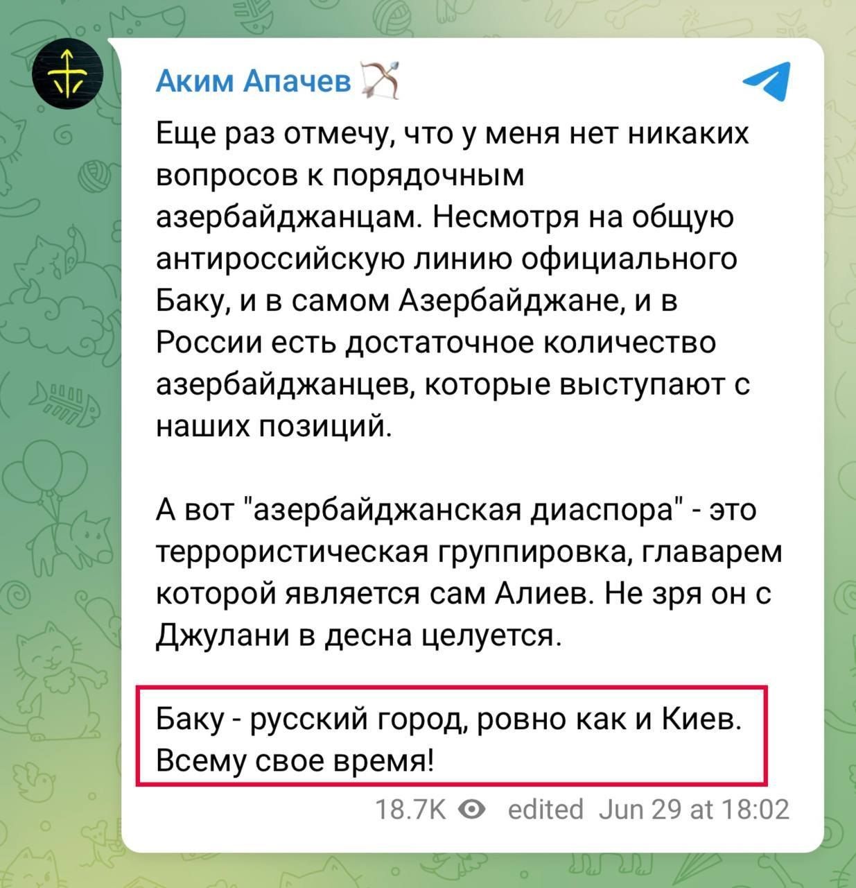 – российский Z-блогер по прозвищу Fighterbomber призывает к жестокому ответу Баку, демонстрируя при этом, что не понимает значения наречия "асимметрично" и не знает, что за убитых 20 сентября 2023 года российских "миротворцев" родственникам выплачены деньги, а президент Азербайджана Алиев извинился за инцидент в разговоре с президентом России уже на следующий день.