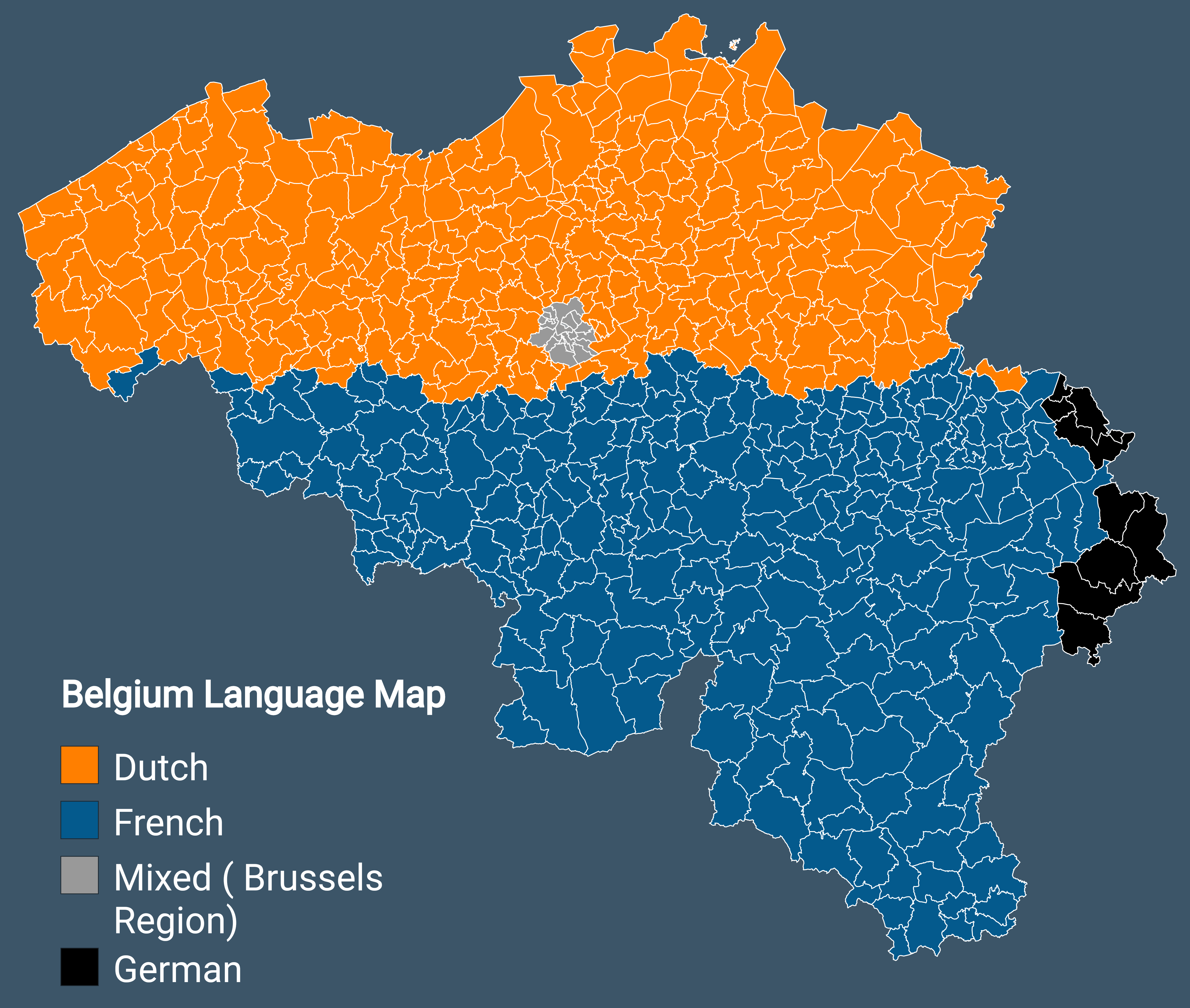 Языковое распределение Бельгии, где оранжевым обозначены нидерландскоязычные земли, синим – франкоязычные, а черным – немецкоязычные, смешанный Брюссель обозначен серым