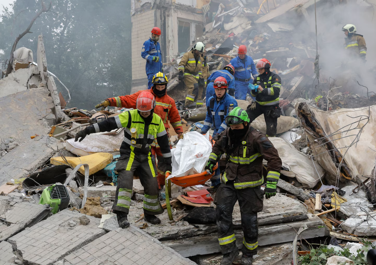 Спасатели выносят тело погибшего после удара России по многоэтажке в Киеве / Фото EPA