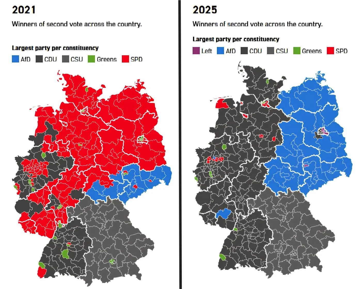 На второй строчке – консервативный блок Христианско-демократический союз и Христианско-социальный союз (ХДС\ХСС), где председательствует действующий канцлер Германии Фридрих Мерц. Блок получил всего 24% благосклонности. Отрыв маленький, однако пока это худший показатель для ХДС/ХСС со времен провального для них 2021 года.