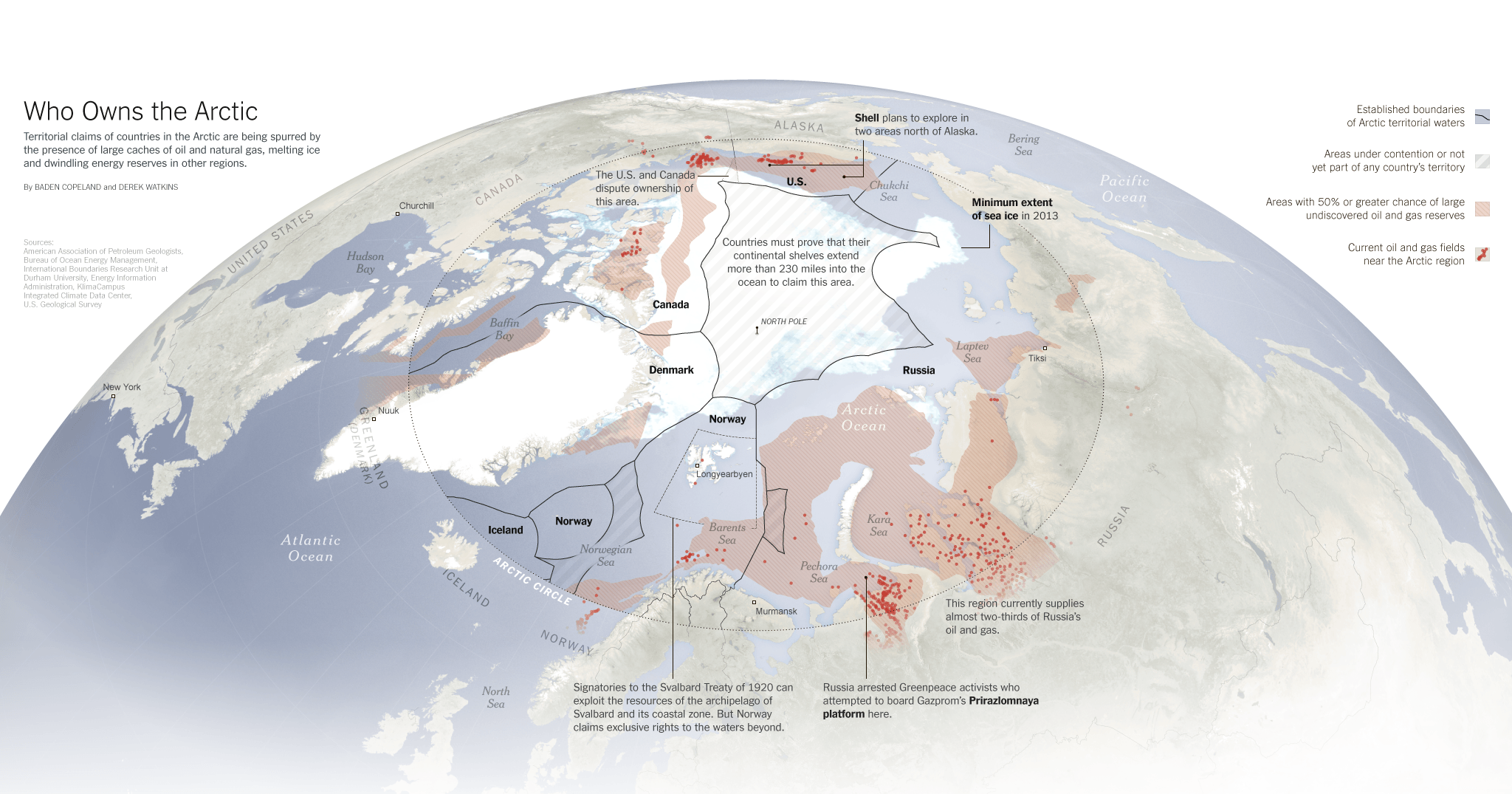 Арктика потенциально имеет большие залежи природного газа и нефти, а часть территории вокруг ледников, которые постепенно тают, официально не принадлежит ни одному государству / Карта The New York Times