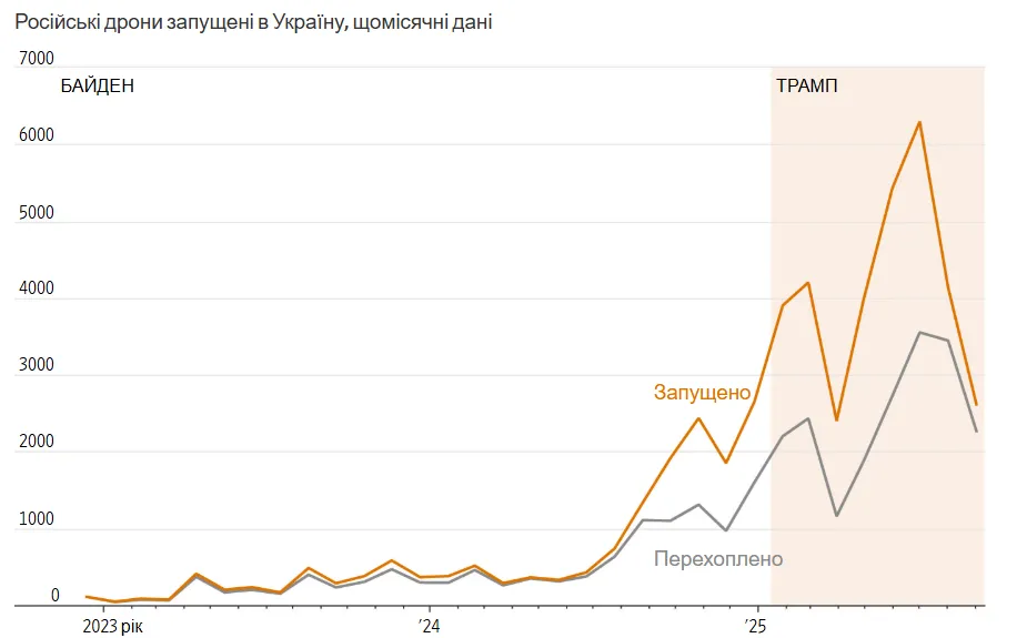 Об этом сообщает 24 Канал со ссылкой на The Wall Streat Journal. Как отмечает издание, самые интенсивные ракетные и беспилотные удары пришлись на лето 2025 года