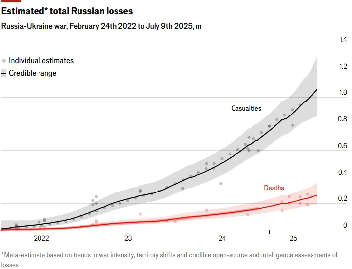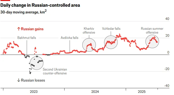 Несмотря на почти рекордное продвижение летом 2025 года, из-за значительных потерь Россия не способна переломить ситуацию на фронте / The Economist