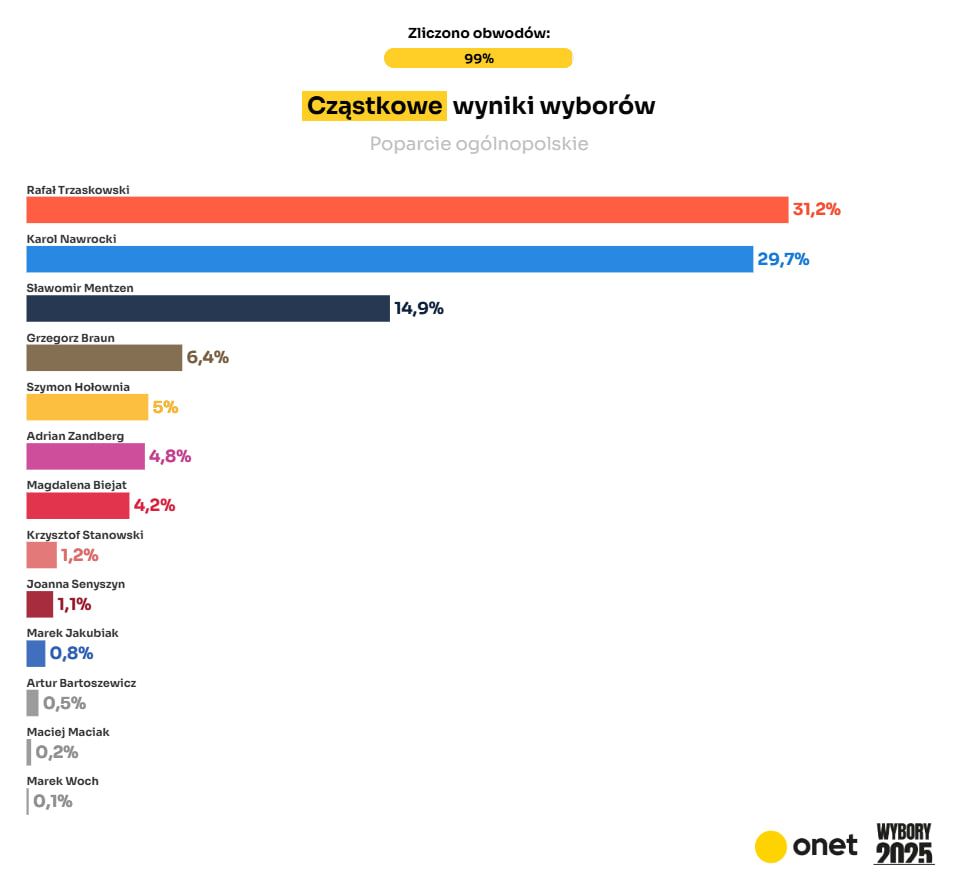 Согласно подсчетам некоторых избирательных округов компанией Onet, Рафал Тшасковский получил 31,2 процента. В свою очередь Кароль Навроцкий получил 29,7 процента. Эту тройку замыкает Славомир Менцен с результатом 14,9 процента.