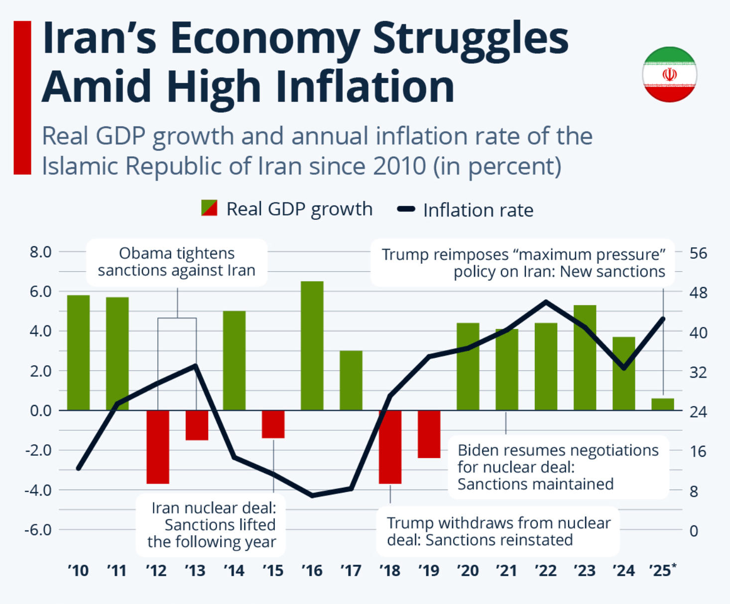 Корреляция роста ВВП Ирана и уровня инфляции с ключевыми политическими вызовами в период с 2010 по 2025 год / Statista