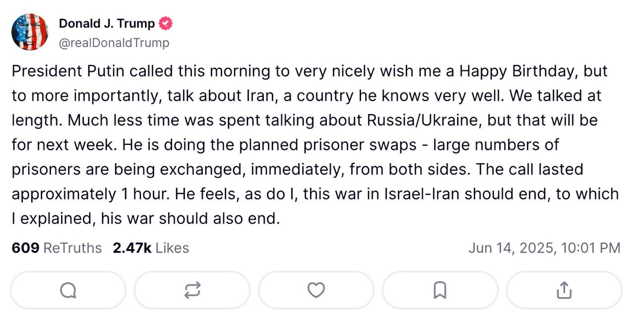 Путин считает, как и я, что эта война между Израилем и Ираном должна закончиться, на что я объяснил, что его война также должна закончиться,