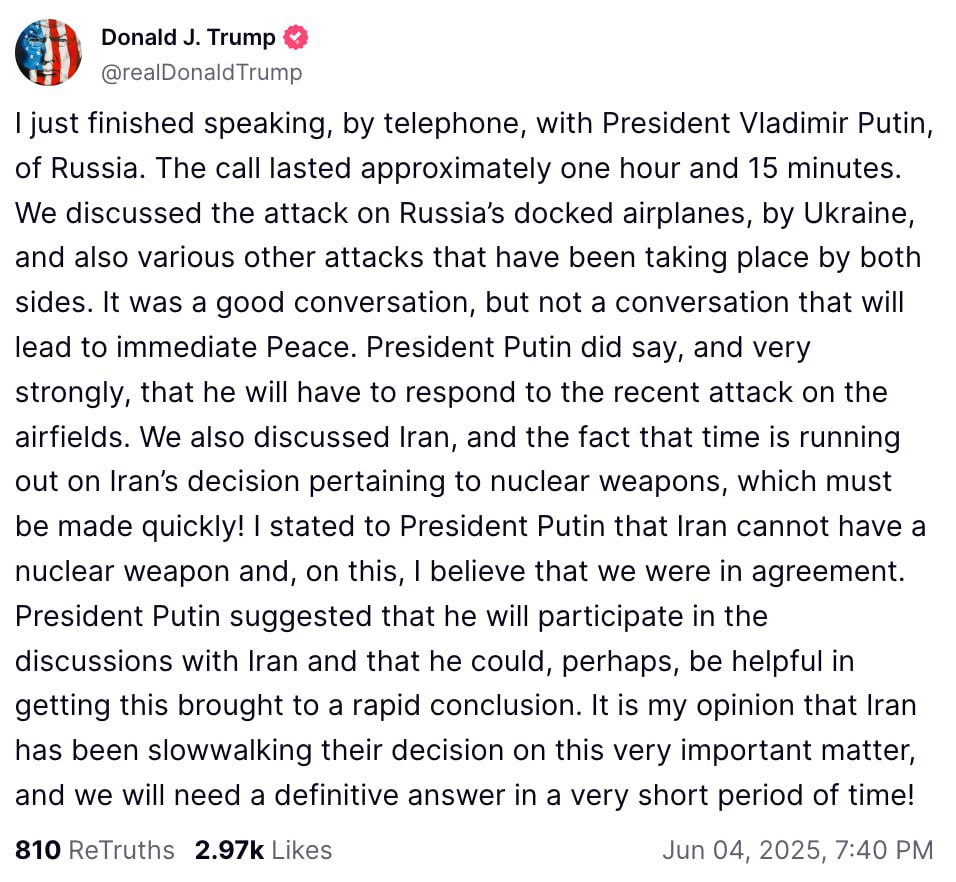 Вечером 4 июня Трамп сообщил, что провел телефонный разговор с Путиным. По его словам, он длился более часа.