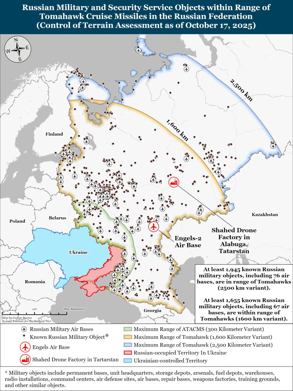 Куда в Россию могут долетать Tomahawk / Карта ISW