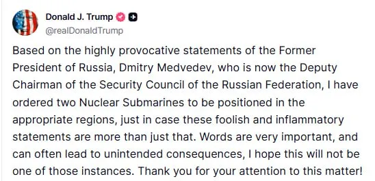 Американский президент написал, что на фоне крайне провокационных заявлений бывшего российского президента Дмитрия Медведева, он приказал разместить две атомные подводные лодки в "соответствующих регионах".