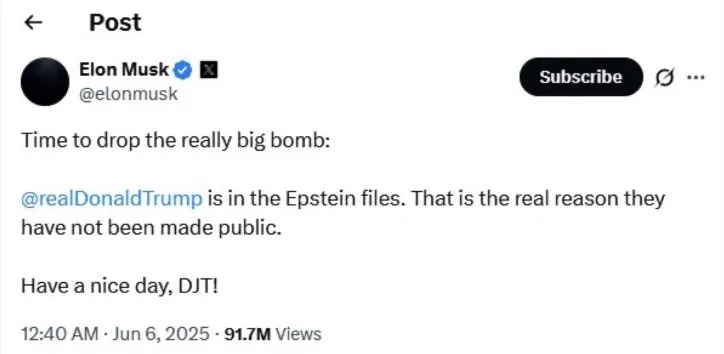 Скриншот удаленного твита Илона Маска о прямой причастности Трампа к "файлам Эпштейна"