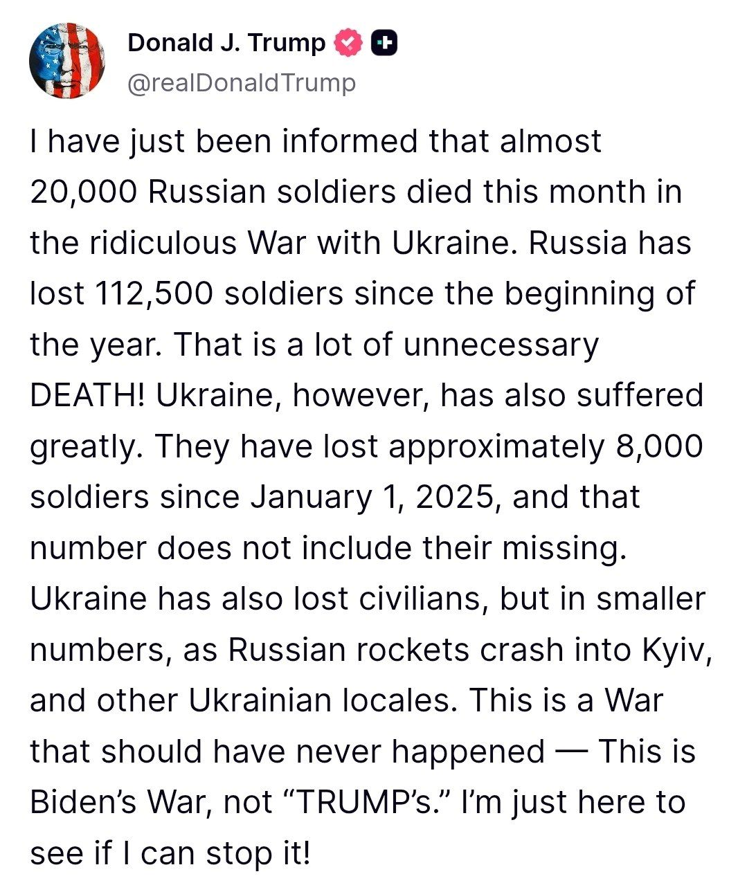 Президент США сообщил, что его проинформировали о потерях России в войне с Украиной. По его данным, почти 20 000 российских солдат погибли в этом месяце, а с начала 2025 года Москва потеряла 112 500 солдат.
