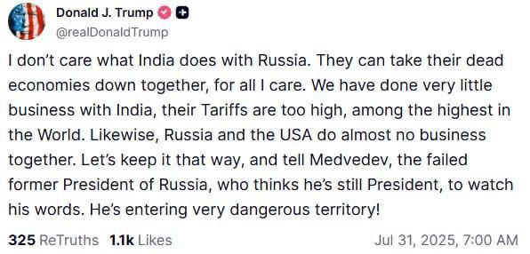 Американский лидер написал об этом в своей соцсети Truth Social, сообщает 24 Канал. Трамп начал заявление с темы торговли Индии с Россией, а дальше обратился к Медведеву.