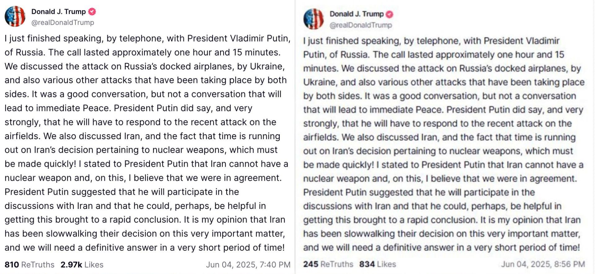Трамп удалил свое сообщение о разговоре с Путиным и запостил новое: что-то изменилось