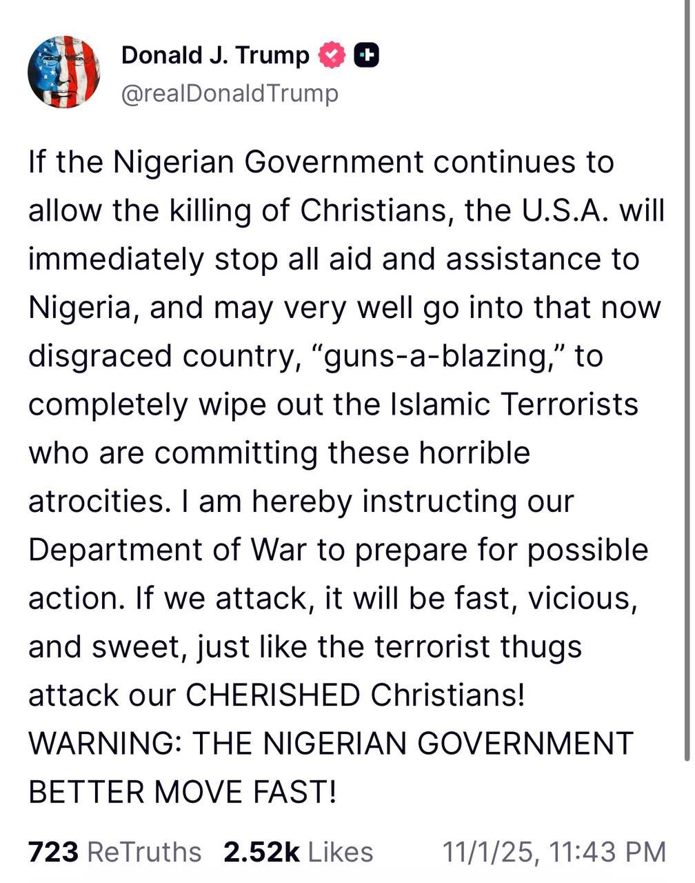 - Дональд Трамп пригрозил военными действиями против Нигерии из-за убийств христиан, обвинив ее правительство в бездействии.