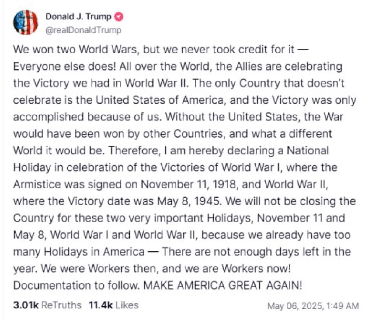 - Трамп объявил праздник в честь побед в Первой и Второй мировых войнах, но отметил, что не будет дополнительных выходных дней в эти даты.