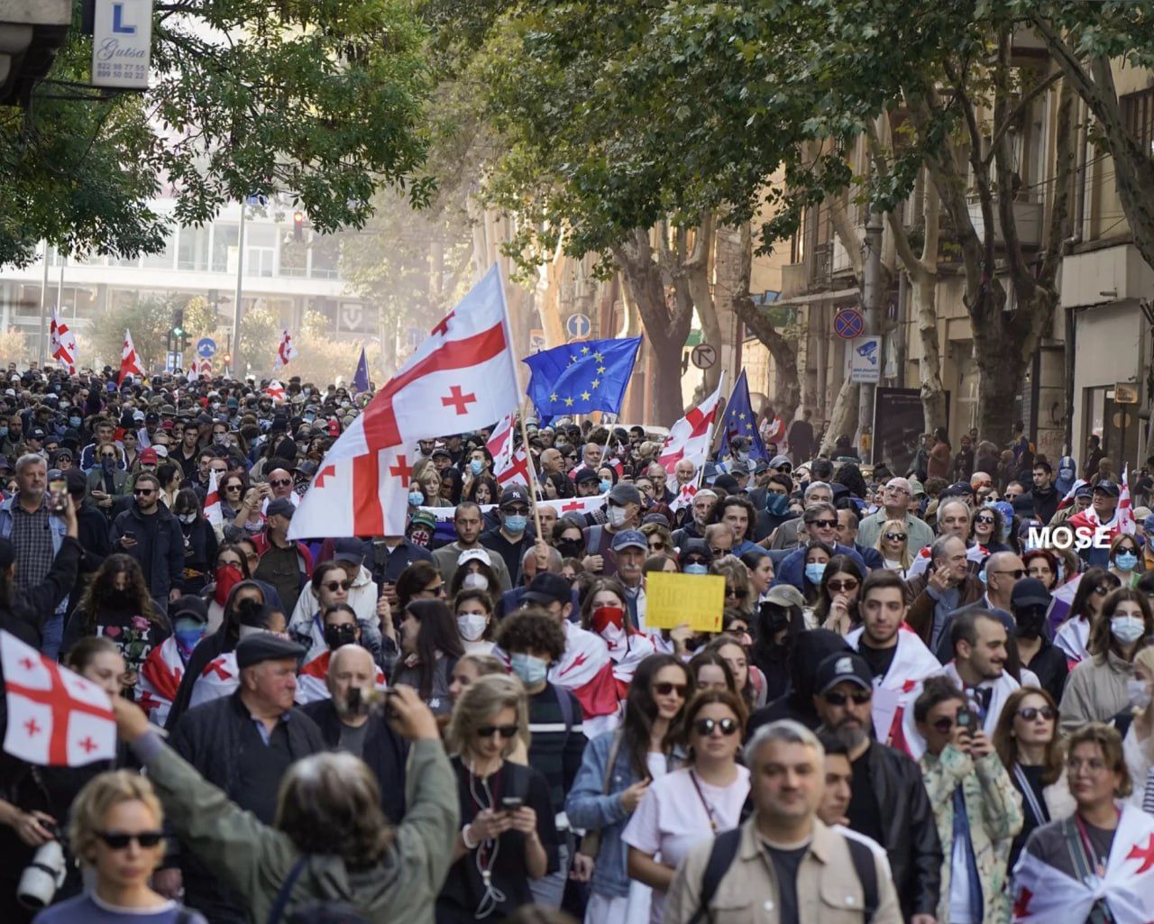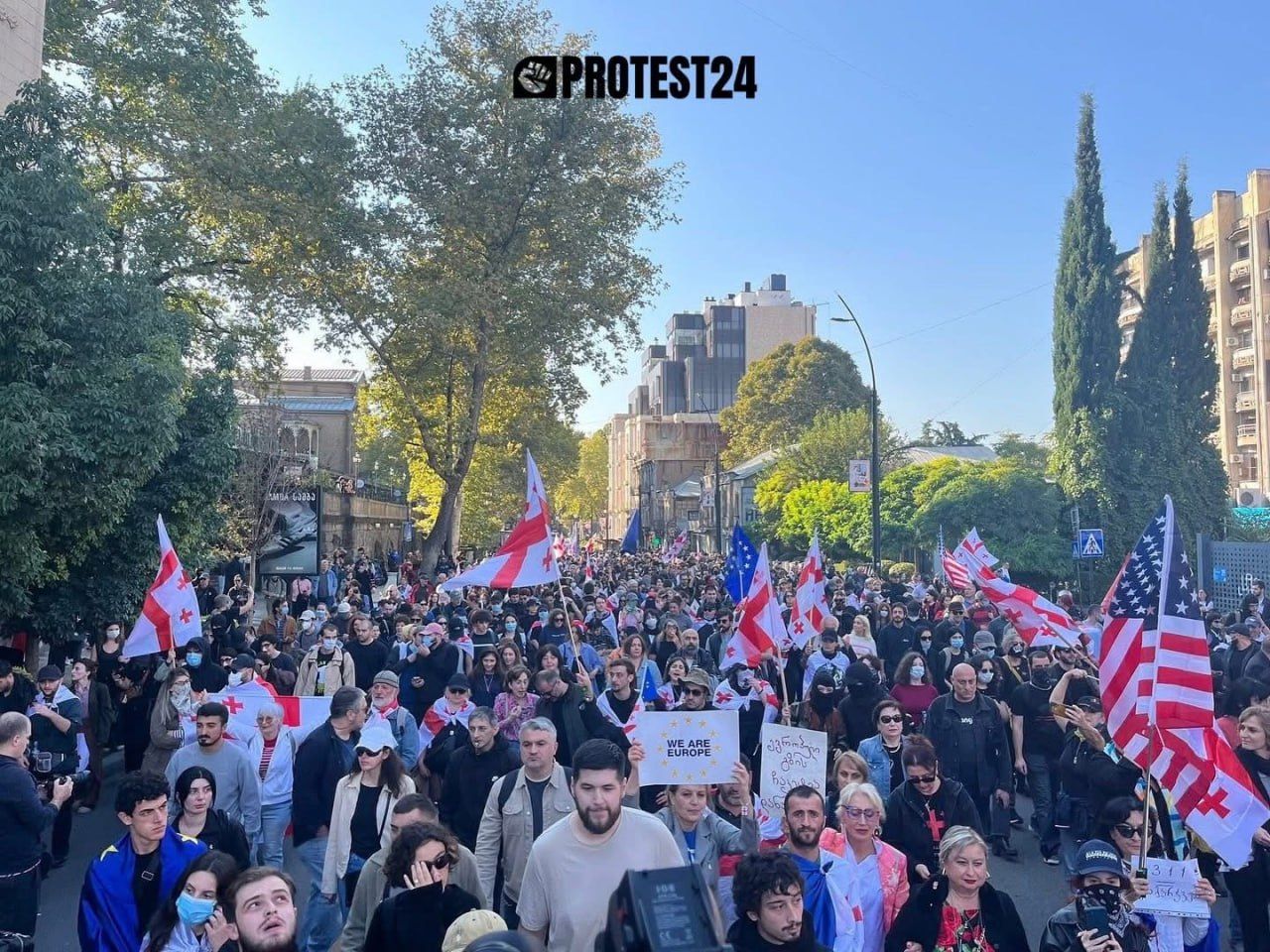 Премьер Ираклий Кобахидзе заявил, что правящая партия "Грузинская мечта" выигрывает во всех городах и муниципалитетах. Еще до его заявления оппозиция созвала людей на протест. Шествие началось с Тбилисского государственного университета до проспекта Руставели. В нем участвуют не только студенты, но и известные люди, например певица Гиули Чохели, которая пришла с портретами заключенного актера и журналистки.