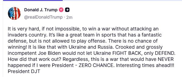 Дональд Трамп раскритиковал Джо Байдена, что тот не позволял Украине бить по России ракетами США / Скриншот из аккаунта президента США в соцсети Truth Social