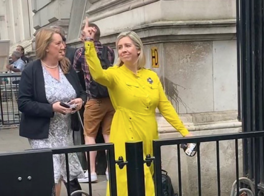 Пожалуй, самое известное фото в политической карьере госпожи Дженкинс. Это 2022 год, она тогда была министром образования в правительстве Бориса Джонсона и так реагировала на неодобрительные крики избирателей на Даунинг Стрит / Скриншот