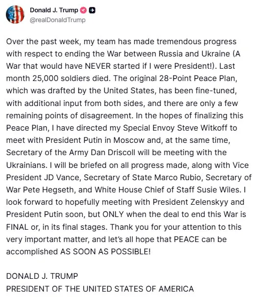 Об этом сообщает 24 Канал со ссылкой на пост Трампа в Truth Social.
