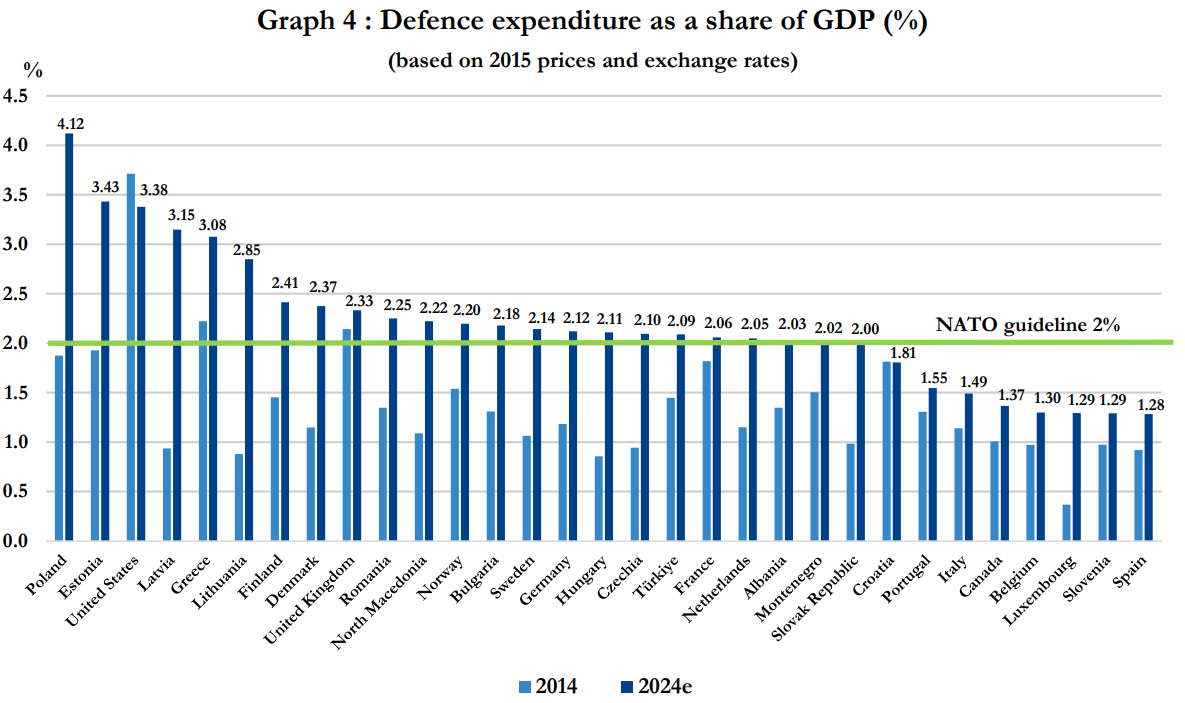 Порівняння витрат на оборону країн-членів НАТО у % ВВП станом на 2014 та 2024 рік / Джерело: пресреліз НАТО
