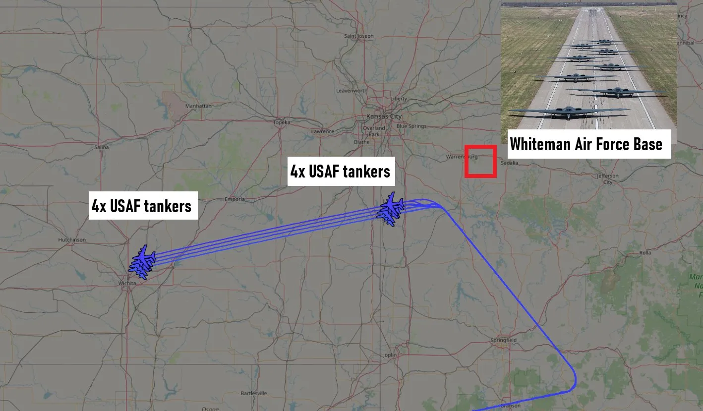 Відомо, що вісім літаків-заправників перебувають у повітрі, прямують у тому ж напрямку та дозаправляють B-2 над Канзасом.