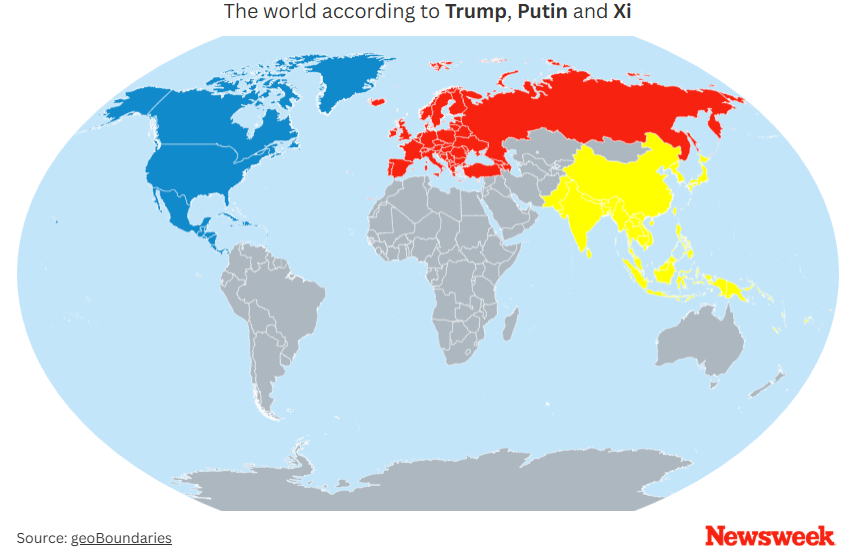 Публікація Newsweek звертає увагу на карту, яку Трамп нібито показував своїм союзникам, де світ поділений між США, Росією та Китаєм.