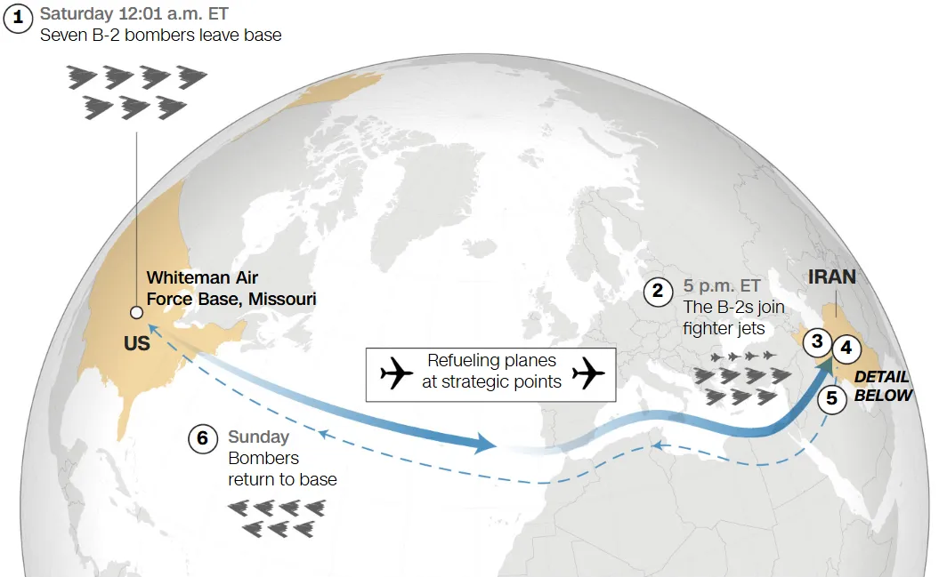 Схема польоту американських бомбардувальників до Ірану та назад / Інфографіка CNN