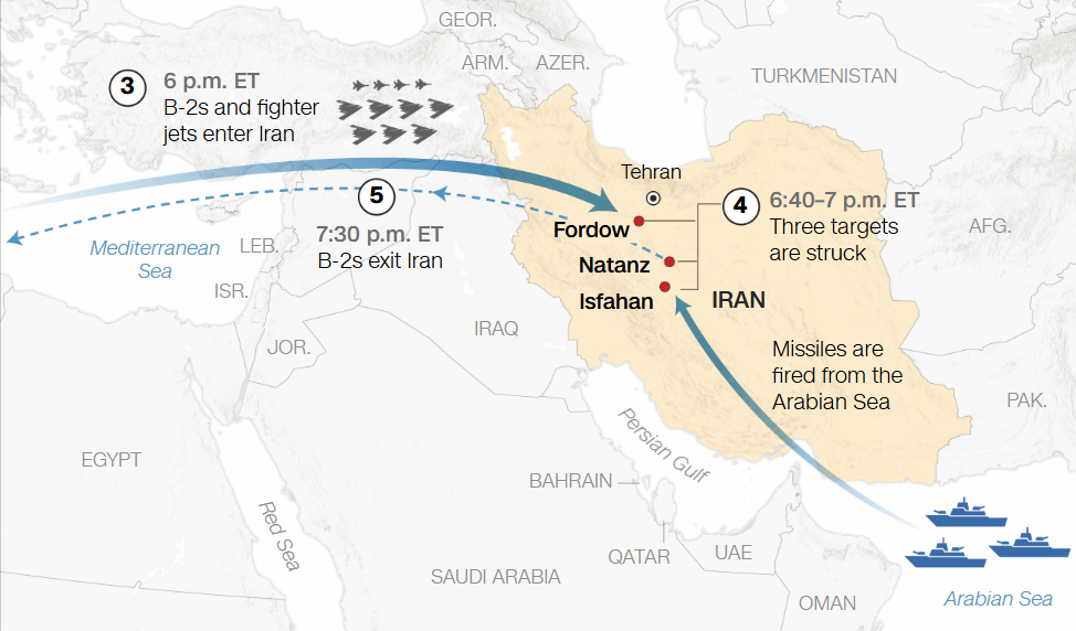 Вже через кілька годин у повітря підіймались літаки B-2 із 13-тонними бомбами, щоб ударити по трьох ключових ядерних обʼєктах Ірану – Фордо, Натанзу та Ісфахану. В усіх деталях перебіг цих подій описує CNN.