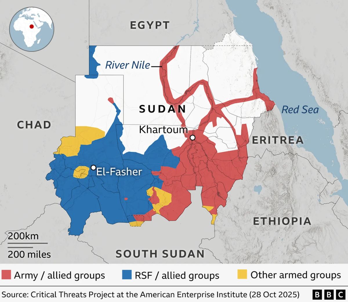 Фактично мільйони суданців опинилися в заручниках у бойовиків, що перетворили й без того проблемну країну на той самий Failed State, без надії та особливих шансів на порятунок. Натомість бойовики не збираються зупинятись – наприкінці жовтня 2025 року RSF відкрили нову ганебну сторінку війни, розпочавши різню мирного населення у місті Ель-Фашер у Північному Дарфурі.
