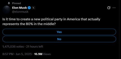 Ілон Маск опублікував опитування на тлі суперечки з президентом США. "Чи настав час створити в Америці нову політичну партію, яка фактично представлятиме 80% середніх верств населення", – йдеться в назві.
