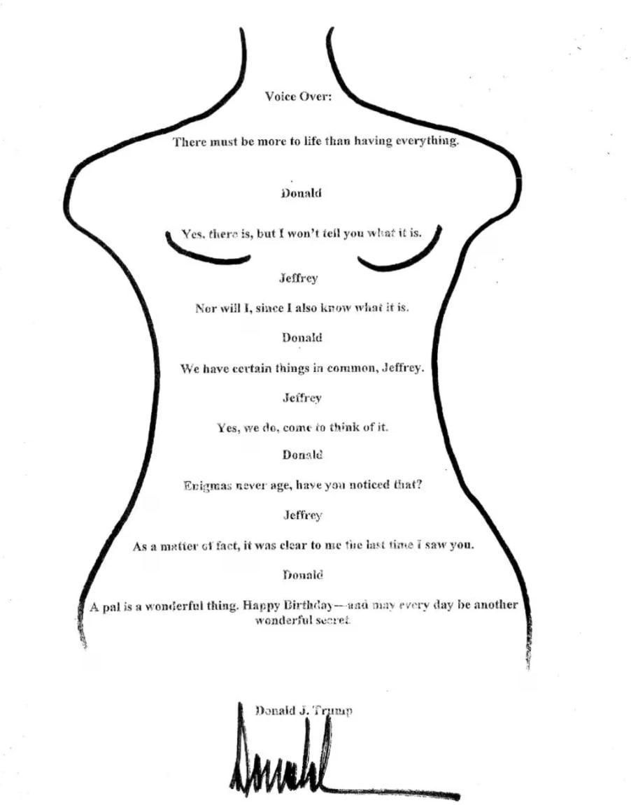У листі, який оприлюднило видання, ймовірно, йдеться про розмову між Трампом та Епштейном на фоні намальованого від руки контуру жіночого тіла. Підпис Трампа розташований трохи нижче стегон на малюнку.
