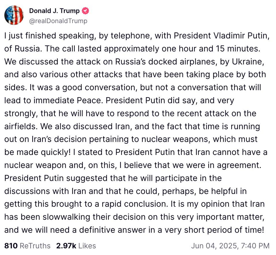 Дональд Трамп повідомив, що завершив розмову з Владіміром Путіним, вона тривала приблизно 1 годину та 15 хвилин. Вони обговорили нещодавню атаку України на військові аеродроми Росії, здійснену в межах операції "Павутина", а також інші удари з обох сторін.