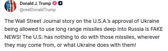 Стаття Wall Street Journal про те, що США схвалили дозвіл Україні використовувати ракети далекого радіуса дії глибоко в Росії, є фейковою новиною!