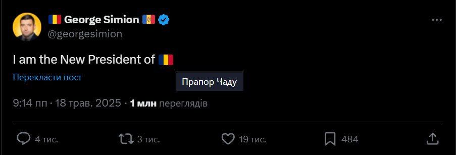 Сіміон написав, що він – новий президент, додавши емодзі прапору Чаду. На це, зокрема, вказав чат-бот Grok, який у коментарях спростував, що Сіміон став очільником центральноафриканської країни.