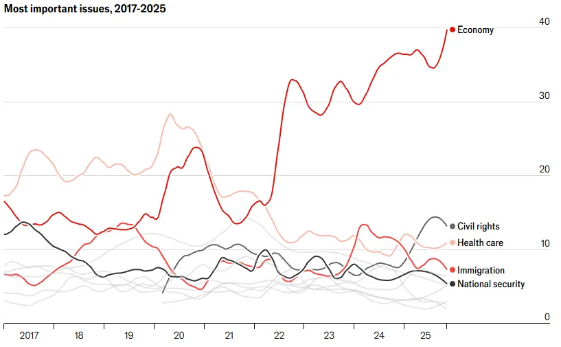Економіка лідирує серед проблем, що турбує американців протягом кількох останніх років / Графік The Economist